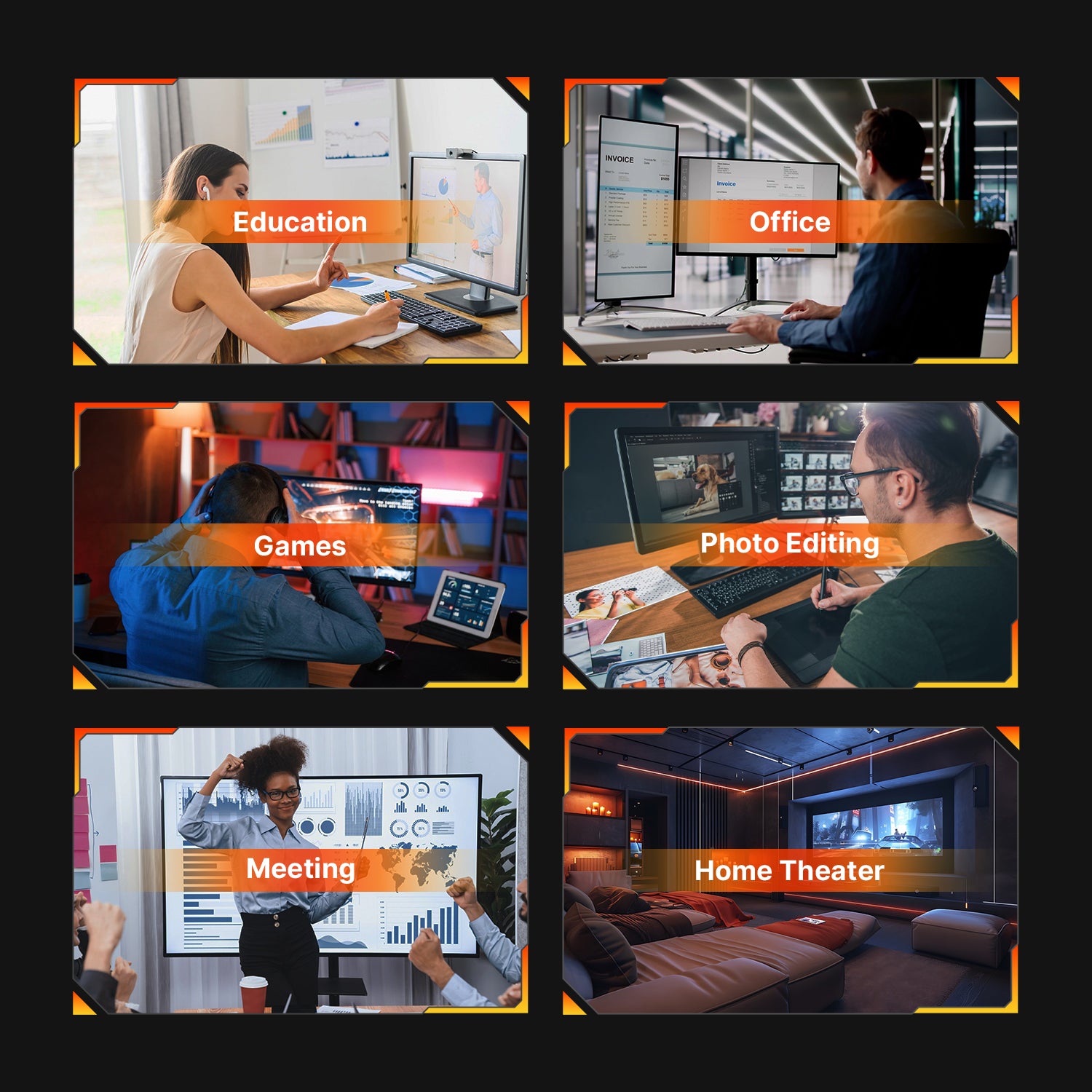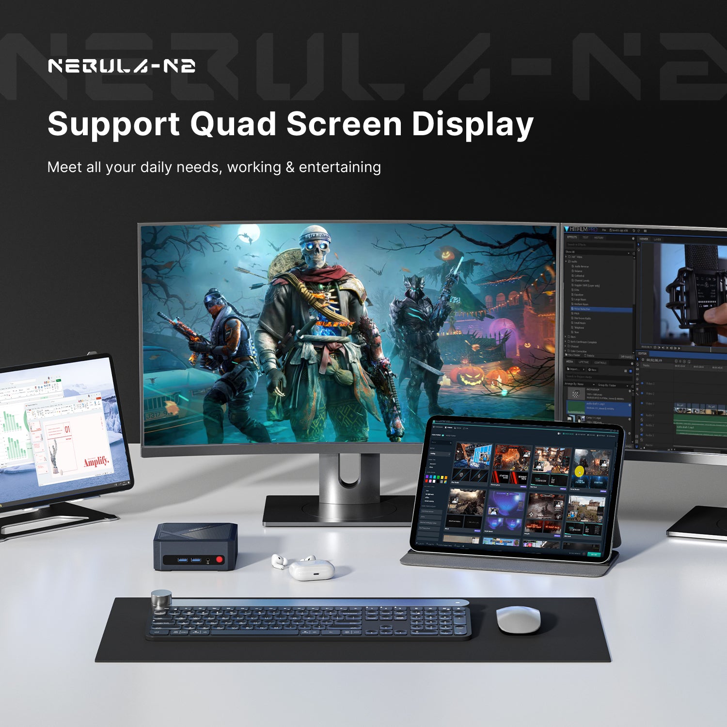 【Quad-Screen Display Support】Featuring dual Type-C and dual HDMI 2.0 ports, the N2 supports 4K@60Hz output across four displays simultaneously. This allows for clear, intuitive information presentation, making multitasking, comparisons, analysis, and meetings more productive, while also reducing eye strain.